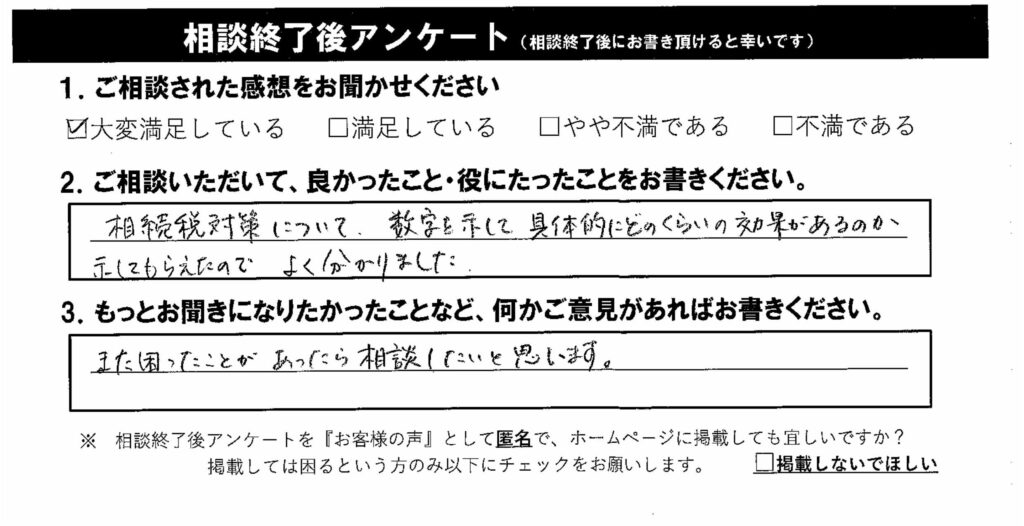 相続税対策について、数字を示して、具体的にどのくらいの効果があるのか示してもらえたので、よく分かりました。