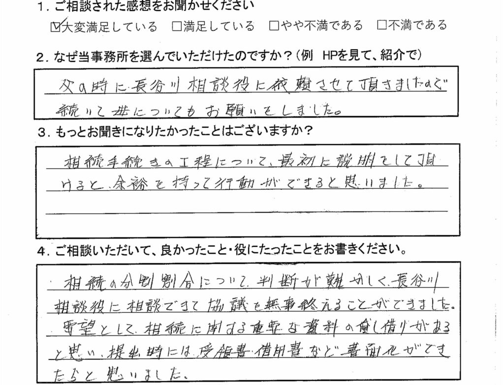 相続の分割割合について判断が難しく、長谷川相談役に相談できて協議を無事終えることができました。